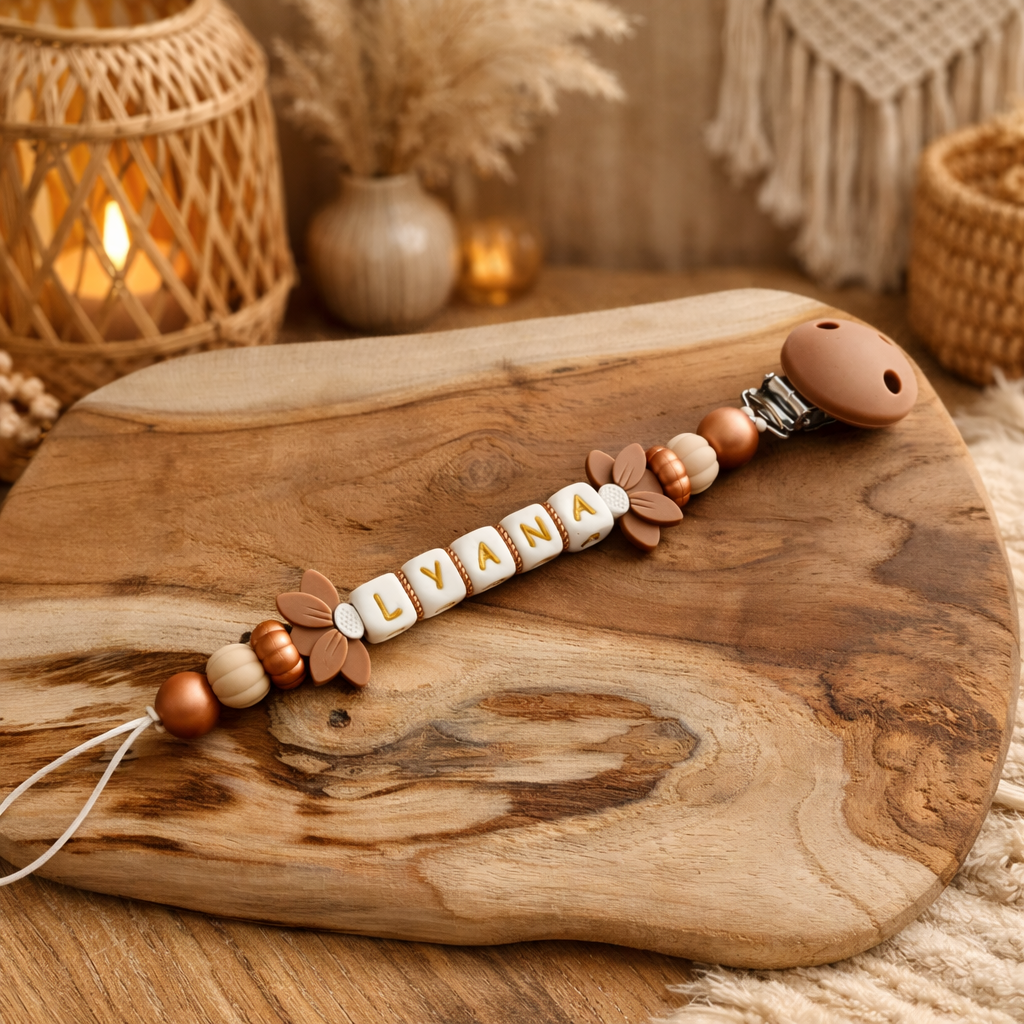« Les attaches tétines peuvent être légèrement ajustées selon la longueur du prénom. Un aperçu de chaque création vous sera envoyé par e-mail pour validation avant l’expédition. »