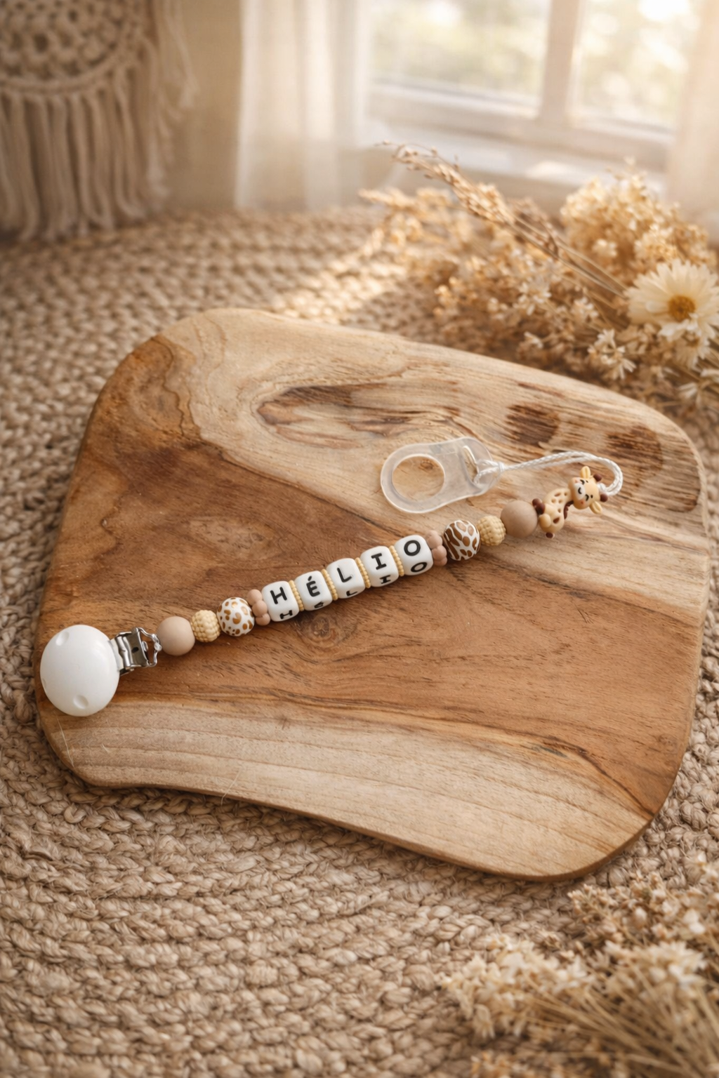 « Les attaches tétines peuvent être légèrement ajustées selon la longueur du prénom. Un aperçu de chaque création vous sera envoyé par e-mail pour validation avant l’expédition. »