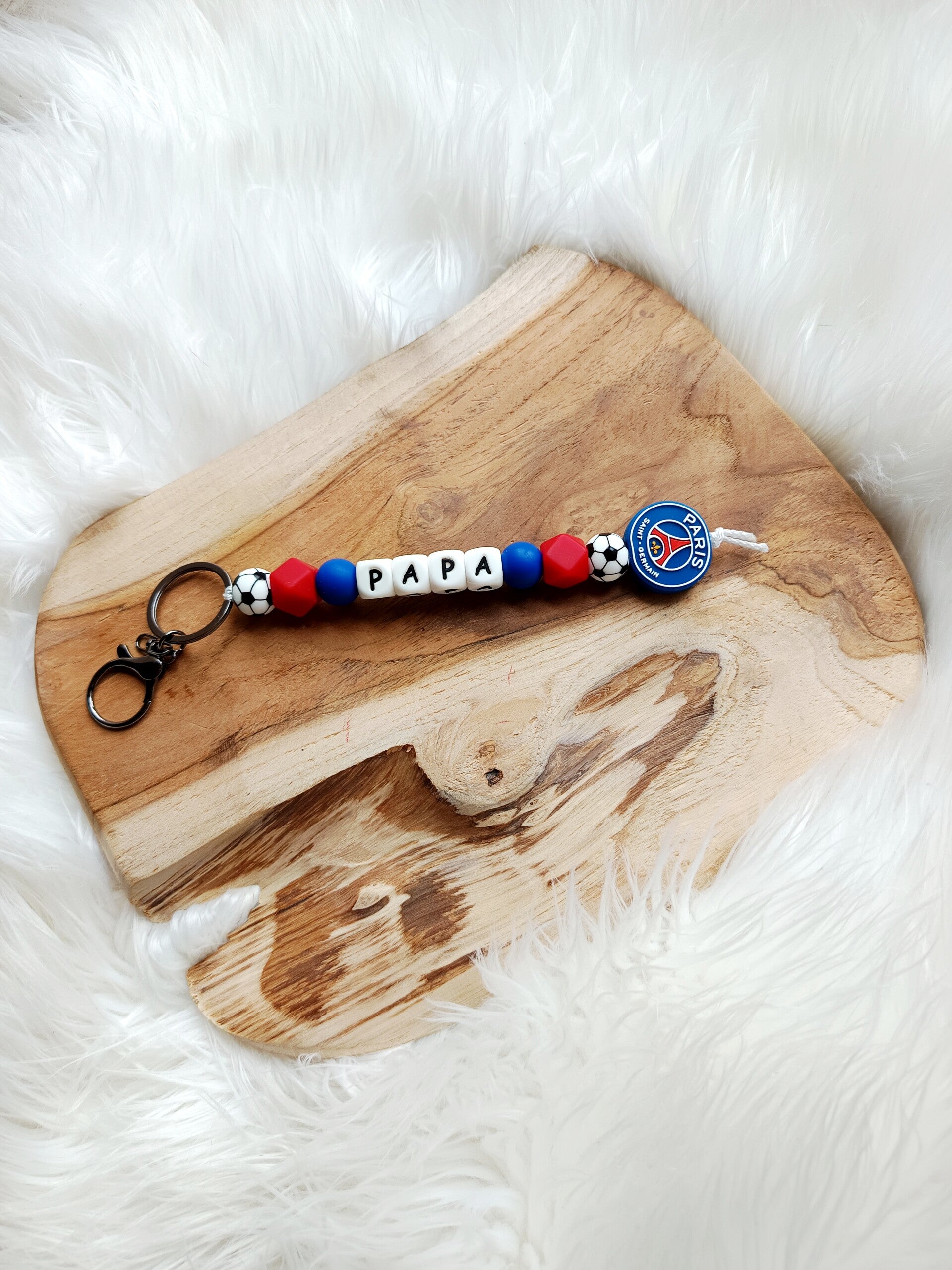 Découvrez ce magnifique porte-clé inspiré du célèbre club PSG, personnalisé avec le mot papa en lettres noires. Il est agrémenté de perles en silicone bleues, rouges et ballon de foot pour un look élégant et sportif à la fois.