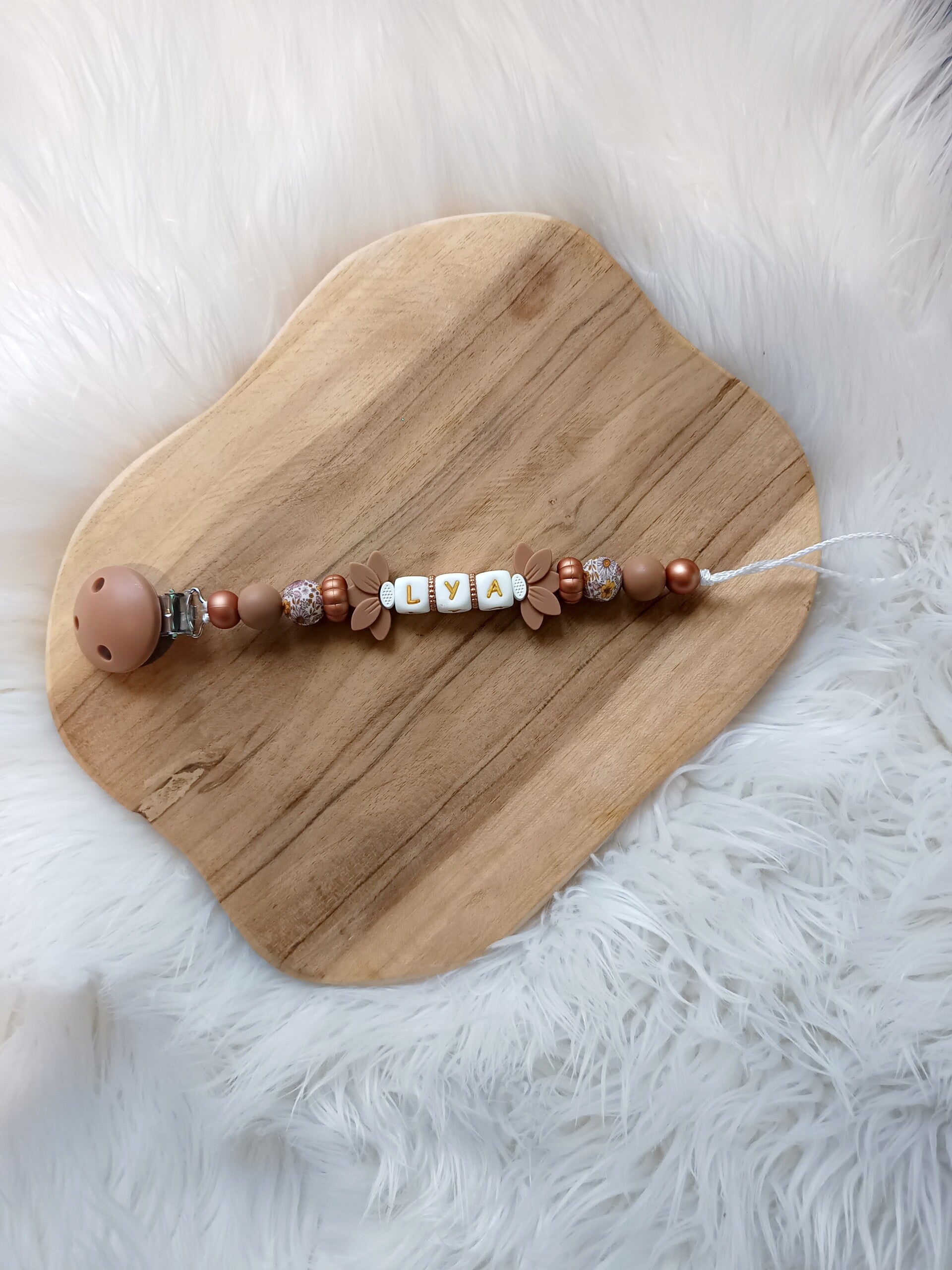 « Les attaches tétines peuvent être légèrement ajustées selon la longueur du prénom. Un aperçu de chaque création vous sera envoyé par e-mail pour validation avant l’expédition. »
