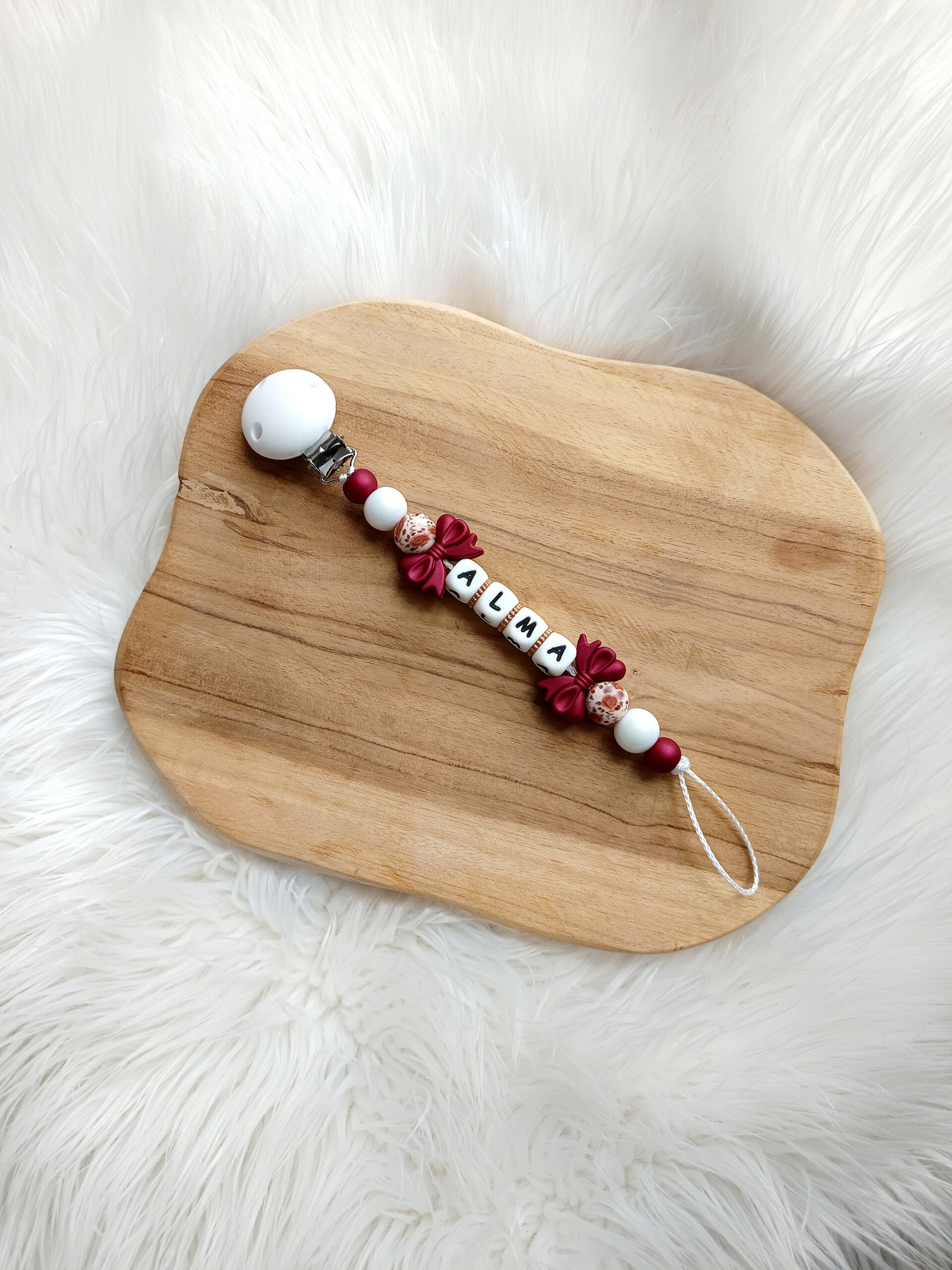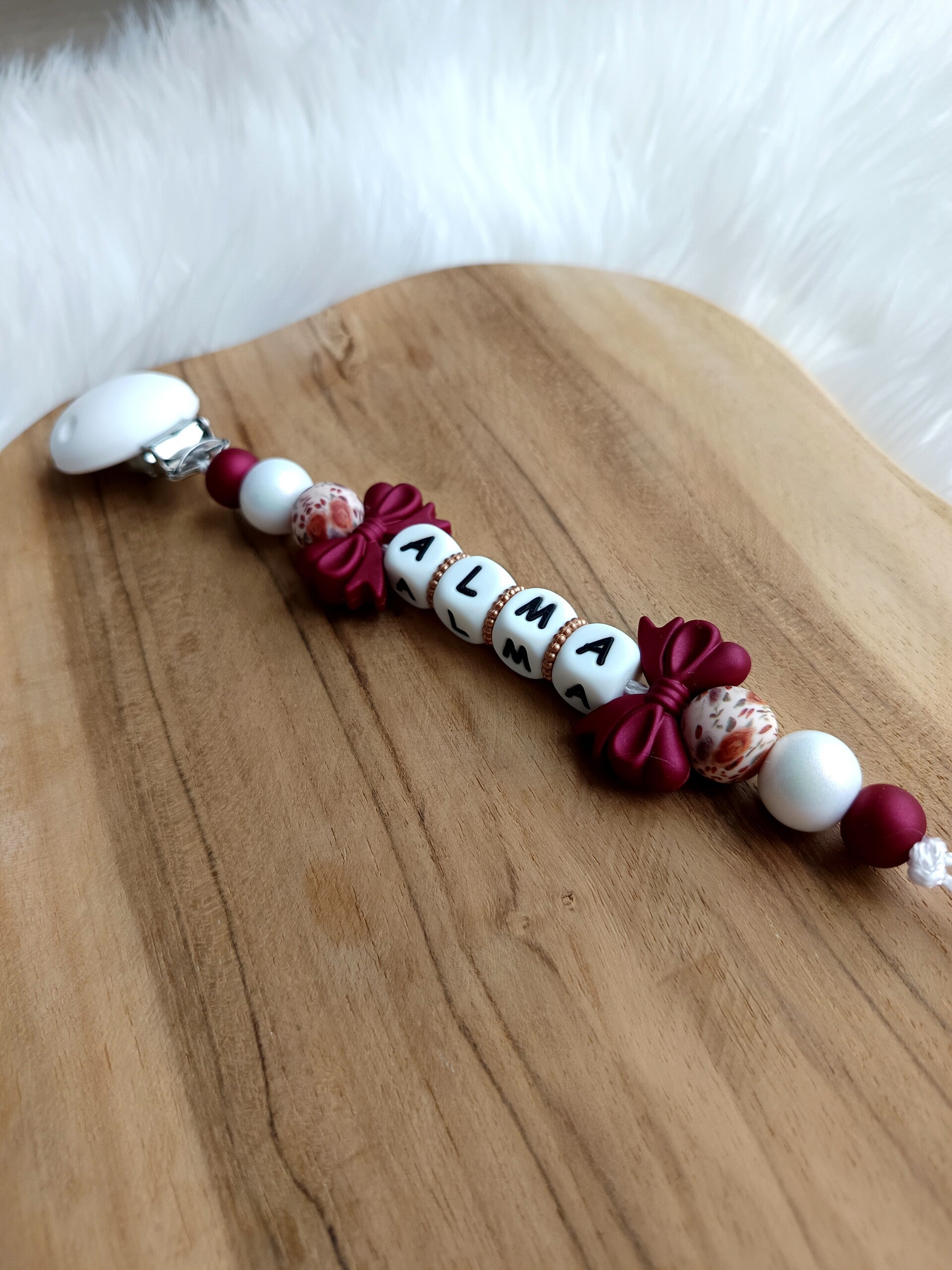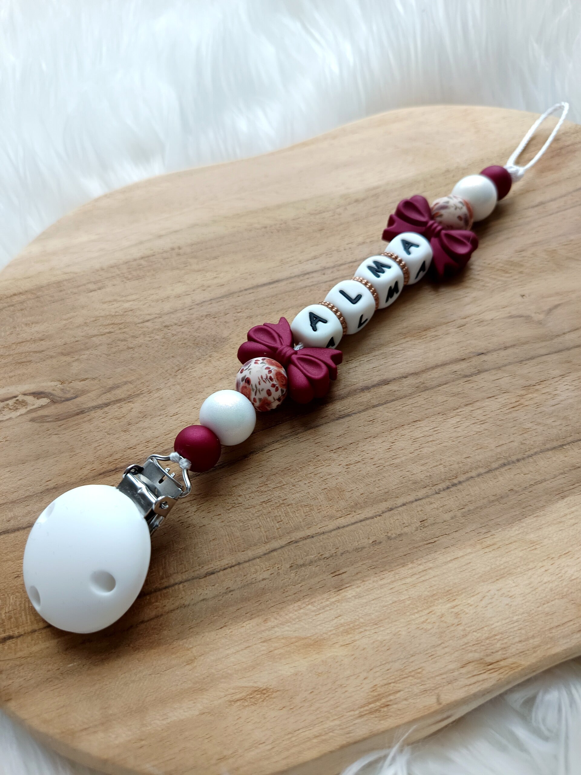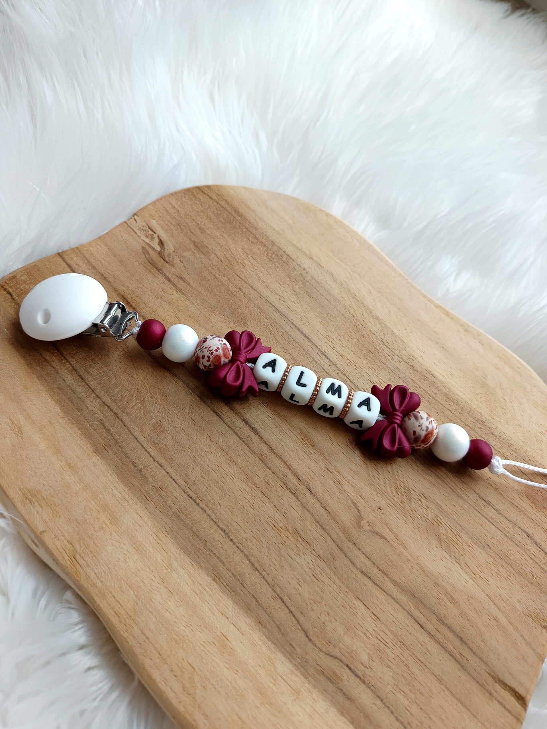 « Les attaches tétines peuvent être légèrement ajustées selon la longueur du prénom. Un aperçu de chaque création vous sera envoyé par e-mail pour validation avant l’expédition. »